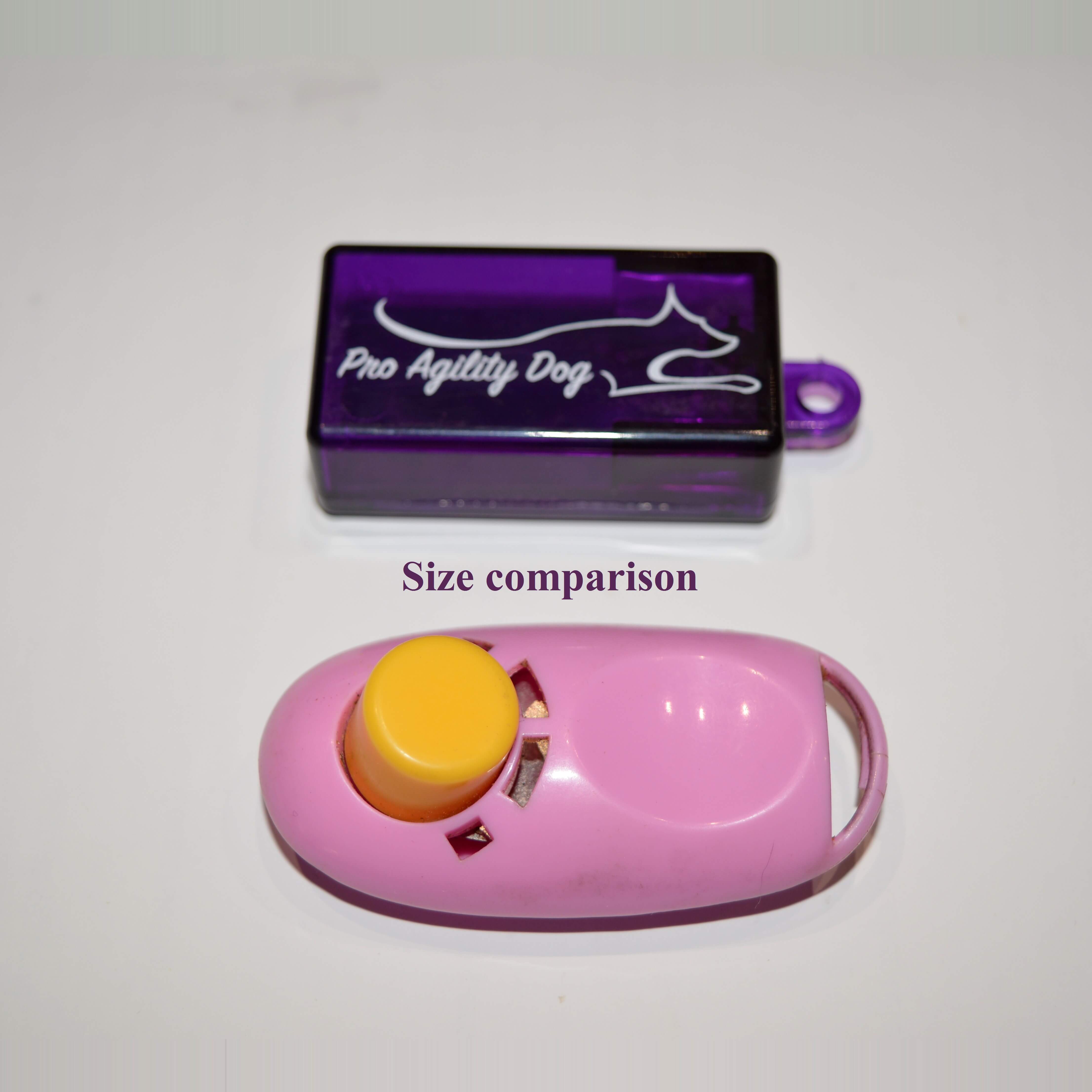 Our Pro Agility Dog clicker is smaller than traditional box type clickers. It’s slim style fits neatly in any hand, or pocket.