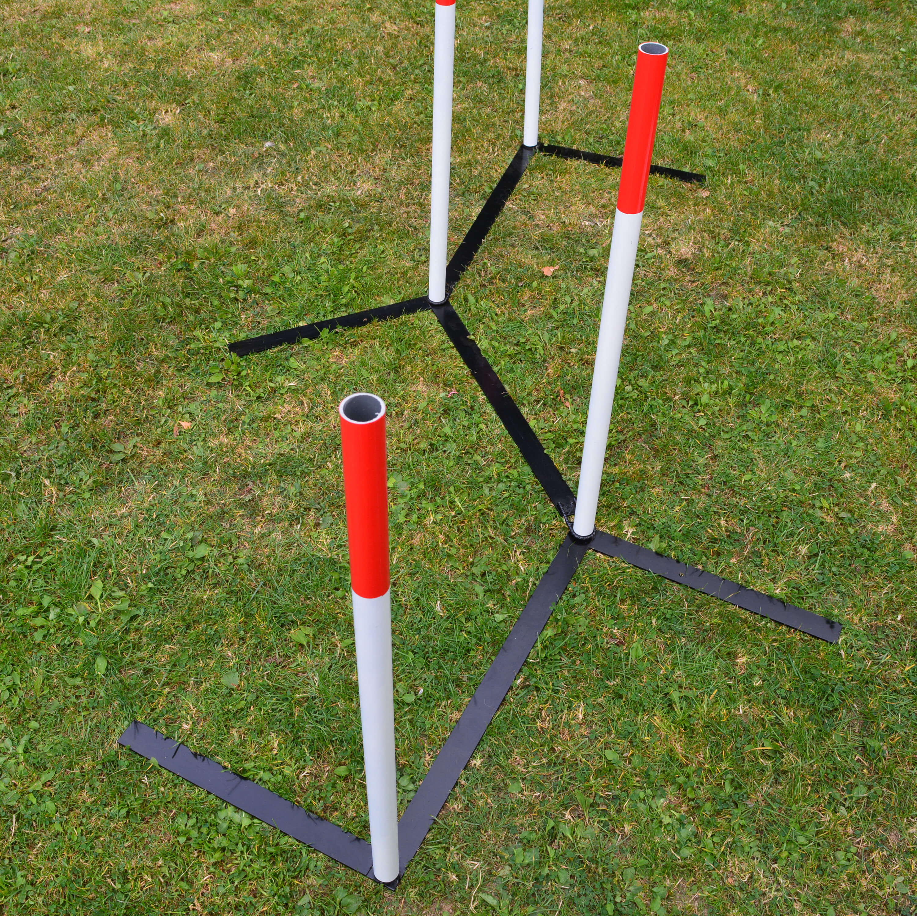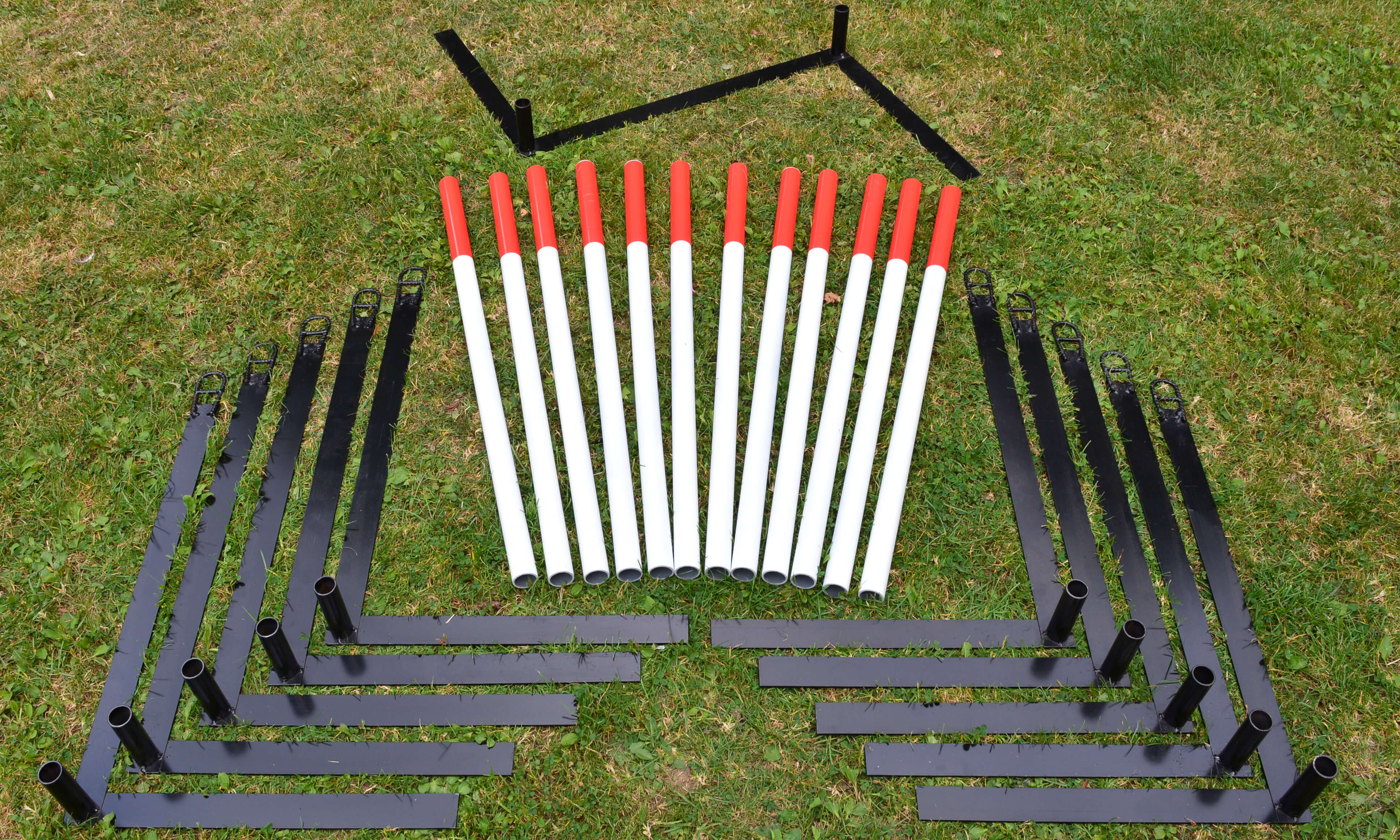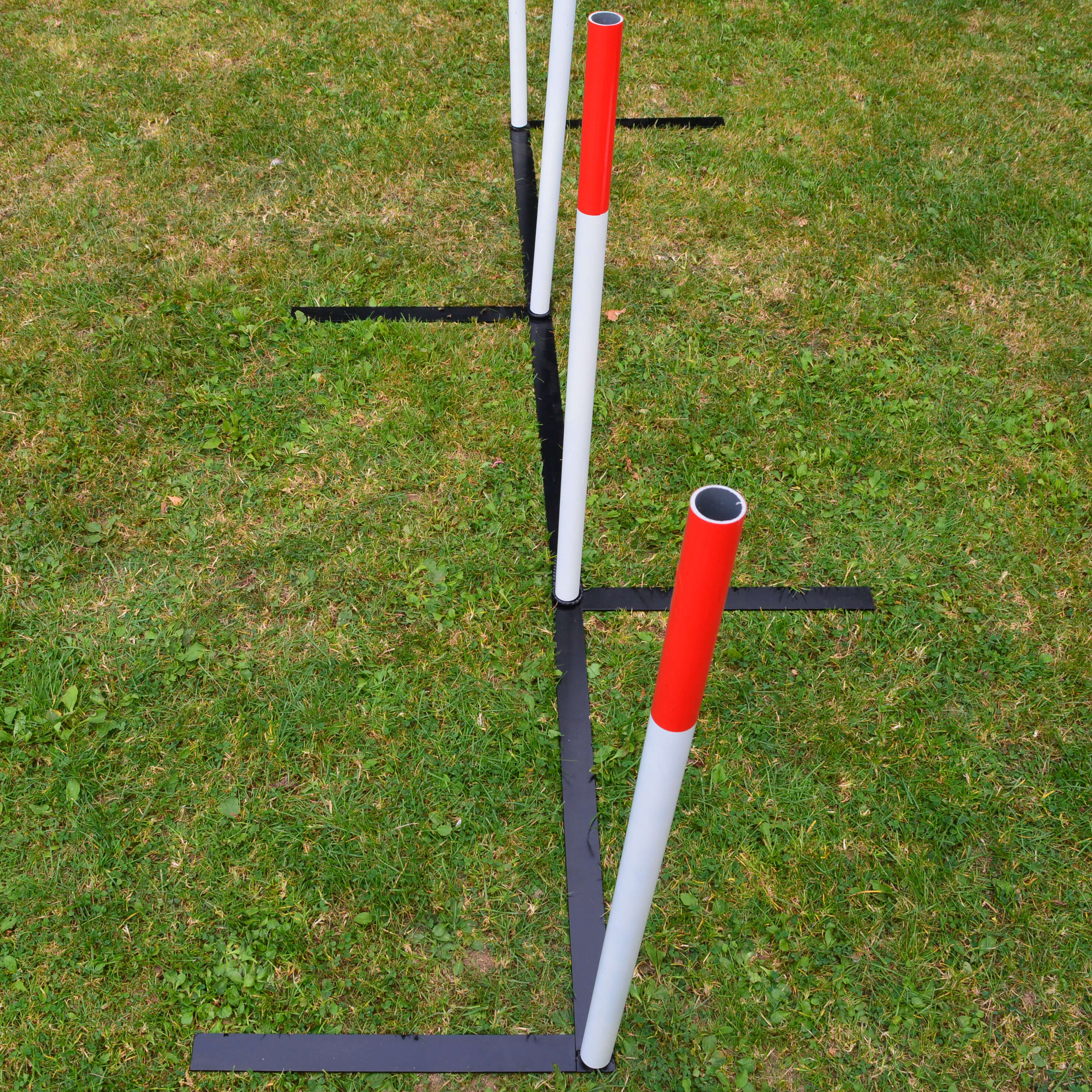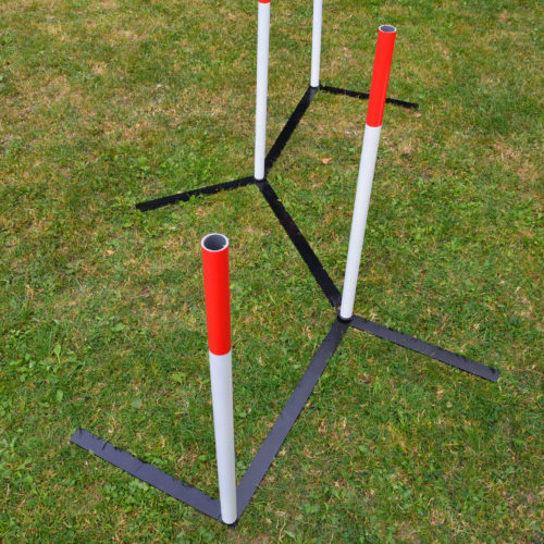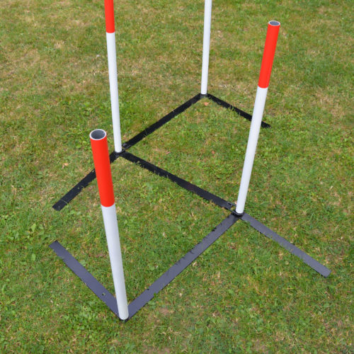 Ajustable weaves that can be set up in a straight line for regular use or set up as channal weaves for training.